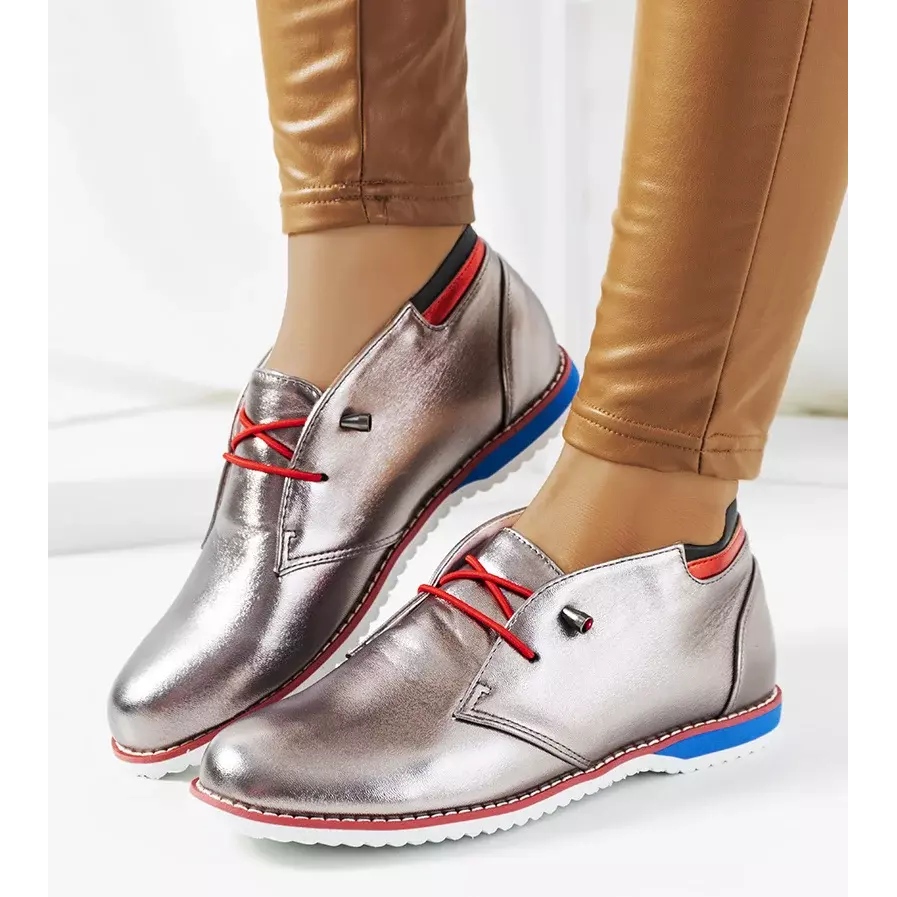Os sapatos femininos Reyes prateados são a escolha perfeita para mulheres que desejam adicionar brilho ao seu estilo de primavera. Confeccionados em couro ecológico de alta qualidade, estes elegantes sapatos destacam-se por uma atraente cor metálica. Os detalhes em vermelho e azul contrastam sutilmente com o prata dominante, conferindo originalidade e expressividade ao calçado.