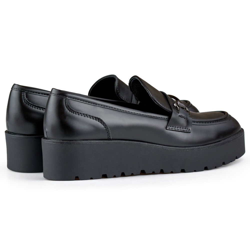Detalhes: Sapatos femininos pretos com cunha baixa, sapatos femininos com plataforma, pretos
