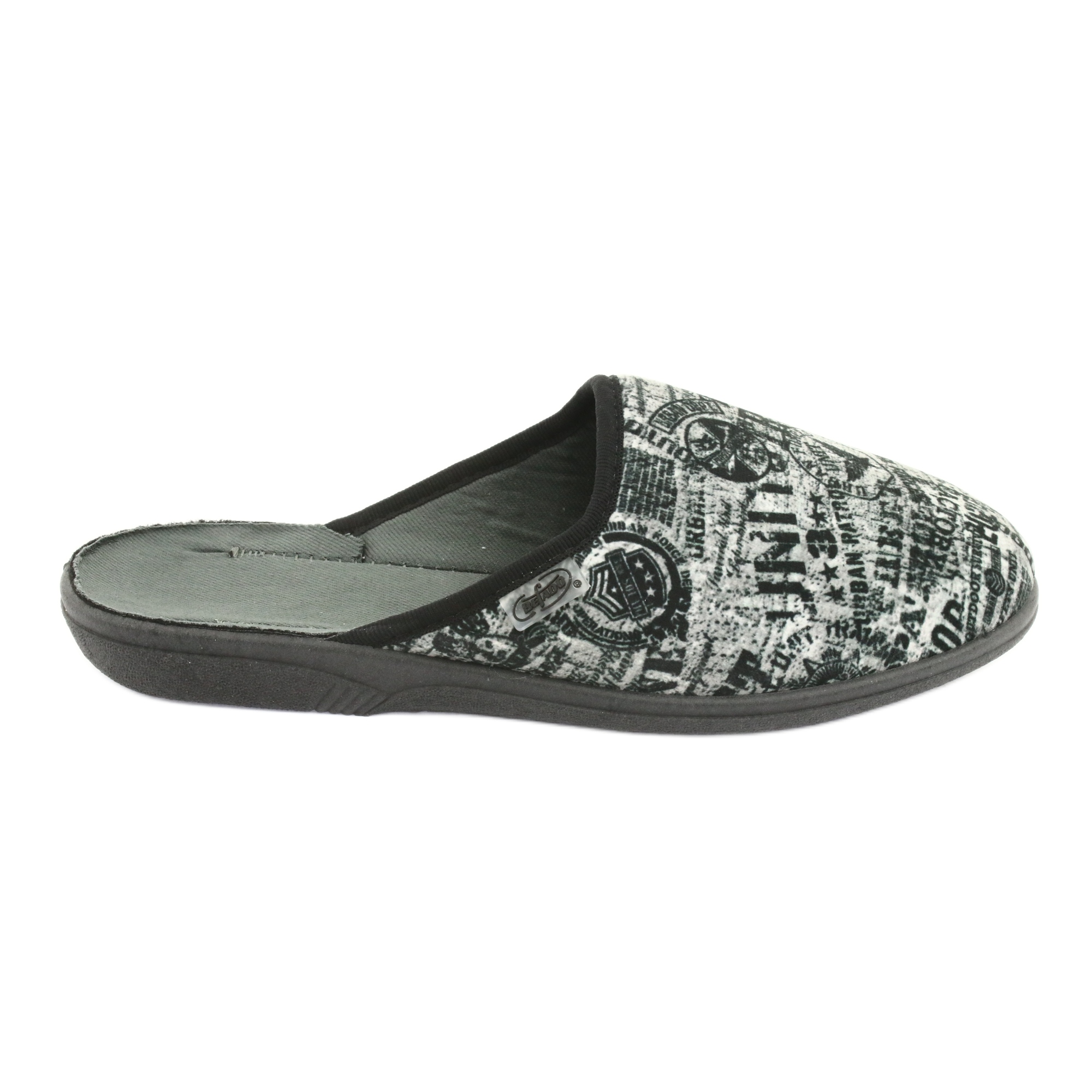Flipers em casa práticos e confortáveis de Befado - Modelo 201Q091 em cor cinza com impressões. Os chinelos escorregados com um dedo do dedo construído fornecem para proteger os dedos, e a sola dura protege os pés contra o frio, mesmo em telhas frias. A inserção de tecido macio aumenta o conforto do uso e fornece respirabilidade.