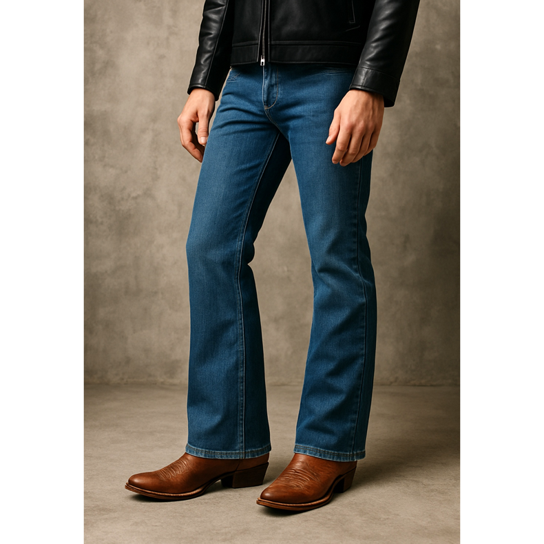 Os jeans bootcut e flare são caracterizados por uma extensão do joelho para baixo, criada especialmente para calçados de cano alto. Os melhores ajustes são: botas de cowboy (botas ocidentais), botas Chelsea, botas jodhpur, botas de trabalho, botas altas com cordões. As pernas devem cobrir a parte superior, caindo ligeiramente sobre o sapato. Evite tênis baixos - eles ficarão perdidos sob calças largas. Jeans bootcut escuros com botas Chelsea pretas e jaqueta de couro dão um look rock. Alargamentos brilhantes com botas de cowboy marrons dão ao estilo uma vibração boho-country. Esse corte de jeans voltou a ser popular na moda masculina moderna.