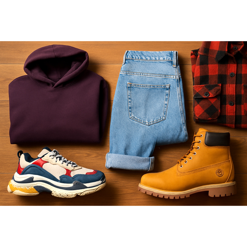 Jeans largos e descontraídos ou jeans de carpinteiro exigem calçados mais volumosos que equilibrem uma silhueta larga. Perfeitos serão: tênis grossos (Balenciaga Triple S, Nike Air Max), botas de cano alto, Dr. Martens, botas Timberland, botas de trabalho, botas de combate, sapatos grossos de skate. Calçados muito delicados se perderão sob as pernas largas. Enrolar as pernas faz com que o estilo pareça mais intencional. Look streetwear: jeans oversized + tênis grosso + moletom oversize. Estilo workwear: jeans carpinteiro + calça Timberland + camisa de flanela.