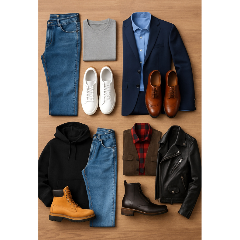 Estilo casual: jeans + tênis ou mocassim + camiseta ou polo é um clássico do dia a dia do fim de semana. Smart casual: jeans escuro + brogue ou derby marrom + camisa + jaqueta - estilo para trabalho com dress code solto ou para eventos menos formais. Streetwear: jeans largos + botas de cano alto ou tênis grossos + moletom oversized - estilo urbano e jovem. Workwear: jeans reto + bota de trabalho + camisa de flanela + colete - inspirado na estética operária. Rock/biker: jeans preto + bota Chelsea ou bota cowboy + jaqueta de couro – um clássico do rock. Cada estilo exige uma combinação adequada do corte do jeans e do tipo de calçado.