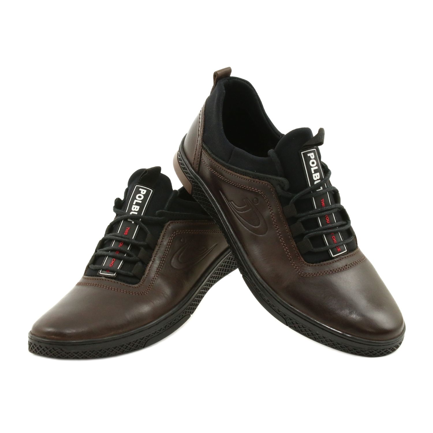 Desenhados em duas cores clássicas: castanho e preto, estes sapatos Polbut oferecem uma elegância subtil sem decorações desnecessárias. Um cabedal uniforme e uma sola marrom contrastante enfatizam a originalidade do modelo, mantendo sua universalidade.