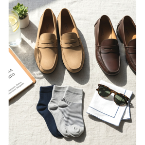 Outra opção são os sapatos de barco ou as alpercatas elegantes (apenas na versão smart casual, por exemplo, camurça). Se for necessário usar terno, escolha brogues claros ou monges marrons claros. Lembre-se que o calçado preto atrai o sol e esquenta mais rápido, por isso no verão vale escolher o marrom, o bege e o azul marinho.