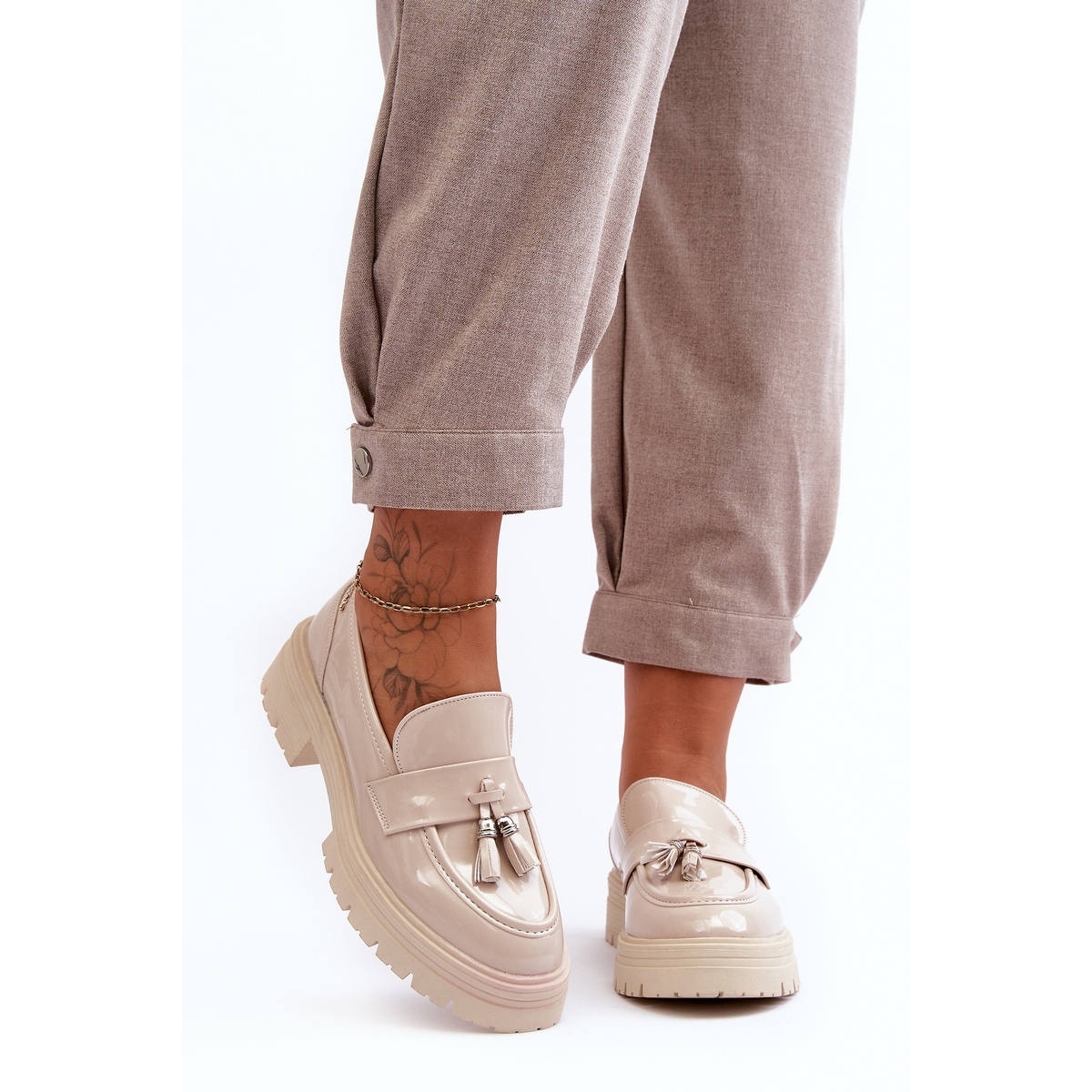 Agusteiras femininas elegantes e envernizadas, que combinam conforto com um acabamento elegante. Um couro ecológico suave em um tom bege, uma tira decorativa com franjas e uma sola grossa de um modelo universal que funcionará para vestidos e jeans.