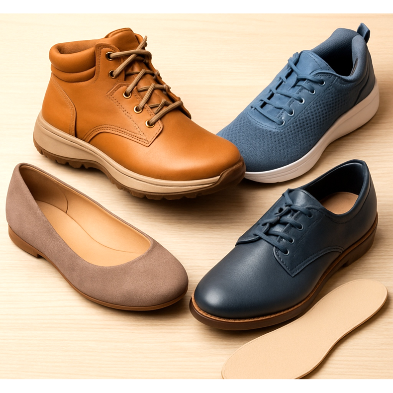 O pé tem um arco alto - você precisa de sapatos com bom suporte de arco e cano mais alto. Evite inserções planas. Pesquise marcas ortopédicas (Vionic, Ecco).
