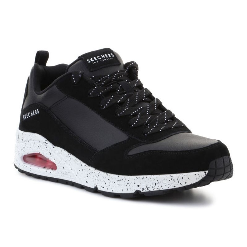 SKECHERS 232153 BKW Sapatos pretos e com calçados esportivos baixos para homens, combinando uma aparência moderna com conforto excepcional. Perfeito para todos os dias, para caminhadas e atividades mais leves no estilo urbano.