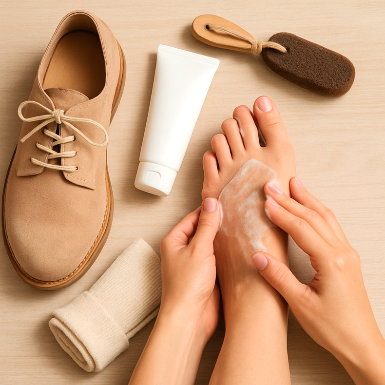 Solução: Sapatos com melhor ajuste, lima para pés, hidratação, pedicure profissional