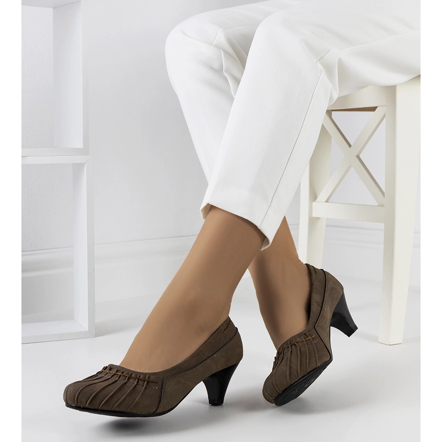 As bombas clássicas e deslizantes de Santro em um tom universal de cáqui é um must-have no guarda-roupa de uma mulher que valoriza um estilo atemporal. Feito de couro ecológico, com uma parte superior suave, eles sutilmente diminuem o pé graças à ferramenta arredondada. O pistão baixo com uma altura de 4,5 cm oferece estabilidade e conforto ao longo do dia, e é por isso que o modelo é ótimo no escritório e durante as reuniões oficiais.