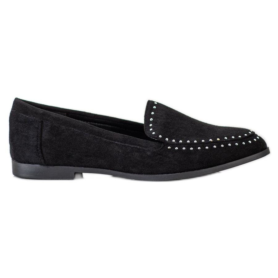 Feitos de imitação de camurça de alta qualidade, esses senhores têm um visual extremamente chique e sua cor preta faz com que combinem com vários estilos. O contraforte do calcanhar é fechado e macio, tornando-o confortável de usar o dia todo. Uma vantagem adicional são as decorações prateadas em forma de strass, que conferem ao calçado um carácter moderno e elegante.