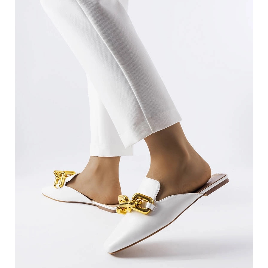 Flip -flops brancos com cadeia de nogueira - mulas elegantes para todas as ocasiões de verão. Escorregou, construído na frente, com um nariz quadrado e esbelto e uma borda ligeiramente irregular da parte superior. Decorado com uma grossa corrente de ouro, feita de couro ecológico de alta qualidade - um sotaque da moda que aparecerá todos os dias e mais elegantes estilização.