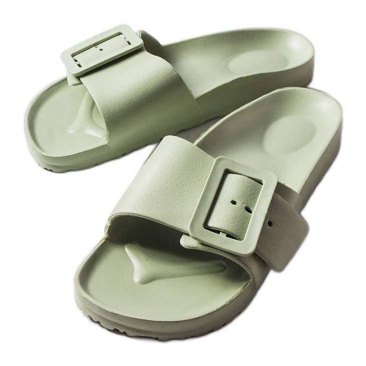 Detalhes: Sliders de borracha verde com fivela da Nelm