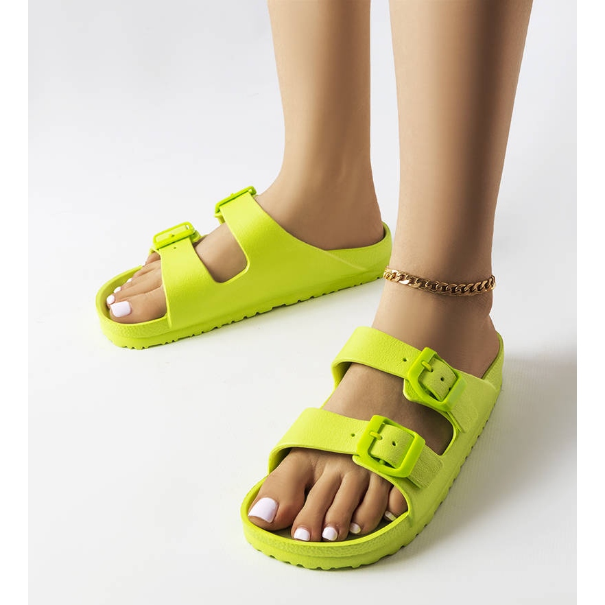 Detalhes: Sliders de borracha verde com fivelas de Eugene