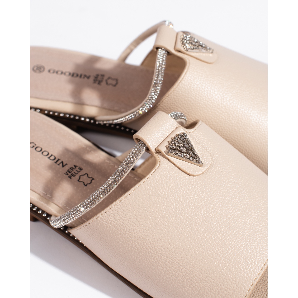Os chinelos são distinguidos por um salto aberto e um corte de deslizamento, o que garante a facilidade de colocar e remover. Feito de materiais de alta qualidade, seu topo é feito de couro ecológico imitando a pele natural, o que lhes dá uma aparência moderna. Além disso, a inserção interna do couro natural oferece conforto e prazer durante a caminhada.