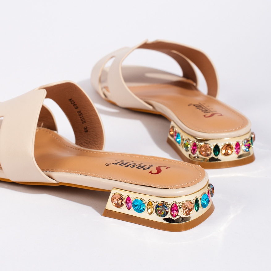 Este modelo é caracterizado por um prendedor deslizante e um salto aberto, o que torna colocá -los e tirá -los rápido e simples. Uma sola lisa feita de plástico durável garante estabilidade e conforto ao caminhar. Além disso, os strass sutis dão aos retalhos um sotaque elegante, fazendo -os se misturar perfeitamente com estilizações diárias e roupas mais elegantes.