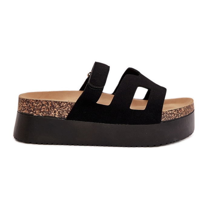 Os chinelos em uma enorme plataforma preta é a escolha perfeita para dias quentes, combinando design moderno com conforto. Feito de camurça ecológica, eles parecem elegantes e elegantes e, ao mesmo tempo, são ecológicos. Uma plataforma enorme com uma altura de 5 cm não apenas adiciona leveza, mas também garante estabilidade ao caminhar.