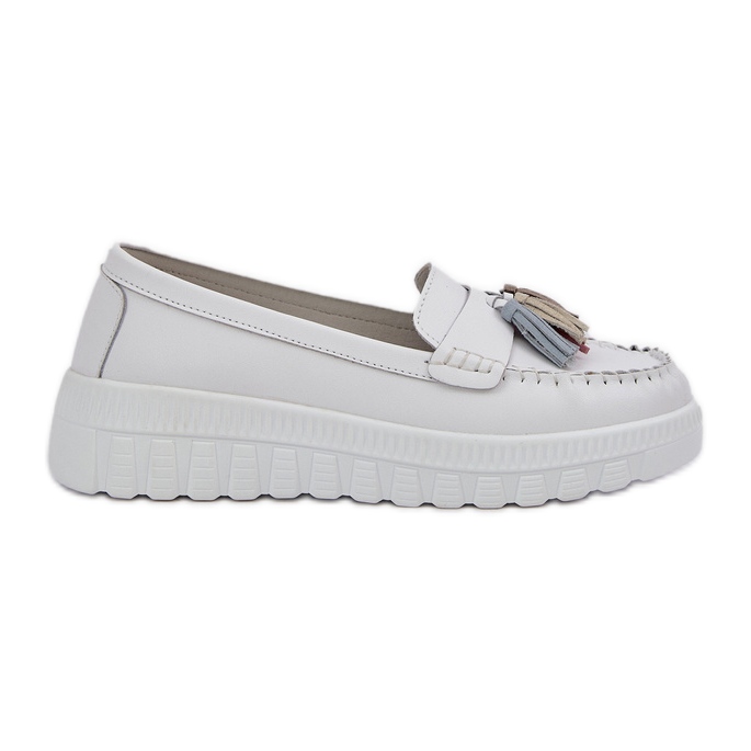Os mocassins de couro feminino com franjas na plataforma em branco são uma ótima proposta para mulheres que valorizam o estilo e o conforto. Feito de couro natural de alta qualidade, esses sapatos elegantes garantem conforto o dia todo. Situados em uma plataforma estável e em uma cunha delicada, eles oferecem uma altura ideal do calcanhar de 5 cm, o que promove conforto ao caminhar.