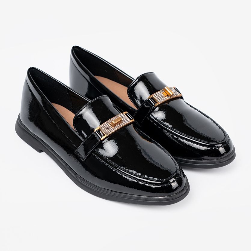 Descubra a elegância no estilo cotidiano com mocassins da marca Shelvt! Esses sapatos cuidadosamente feitos em uma cor preta clássica certamente atrairão a atenção. A camada superior do sapato foi feita de couro ecológico envernizado, o que lhes dá estilo e brilho excepcional. A decoração de ouro na frente do calçado é um sotaque sutil que enfatiza seu caráter elegante.
