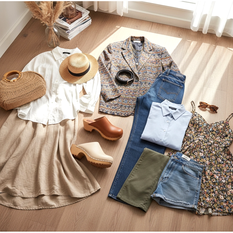 Uma proposta moderna são os tamancos combinados com jeans de perna larga e jaqueta oversized - uma combinação da fronteira dos anos 70 e 90, extremamente atual em 2026. Para o escritório, use um dress code casual: tamancos de couro macio com scarpins clássicos ou calças de algodão vincadas com camisa - fica surpreendentemente elegante. Para o verão: tamancos como alternativa aos chinelos com vestidos curtos ou shorts - confortáveis e visíveis.