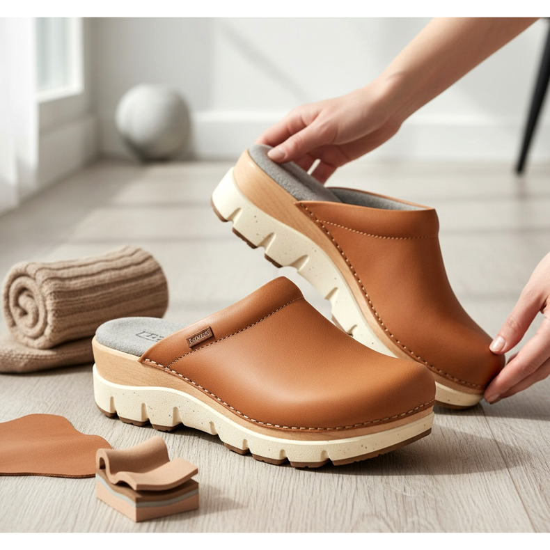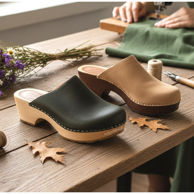 Bons tamancos devem ter um forro interno feito de material macio ou espuma que amorteça cada passo. A parte superior em couro natural adapta-se ao formato do pé ao longo do tempo, tal como acontece com os sapatos tradicionais de couro. É importante escolher o tamanho certo - os tamancos não devem ser muito soltos nem muito apertados. Ao calçá-los pela primeira vez, vale a pena calçá-los um pouco para que seus pés se acostumem com o novo formato do calçado.