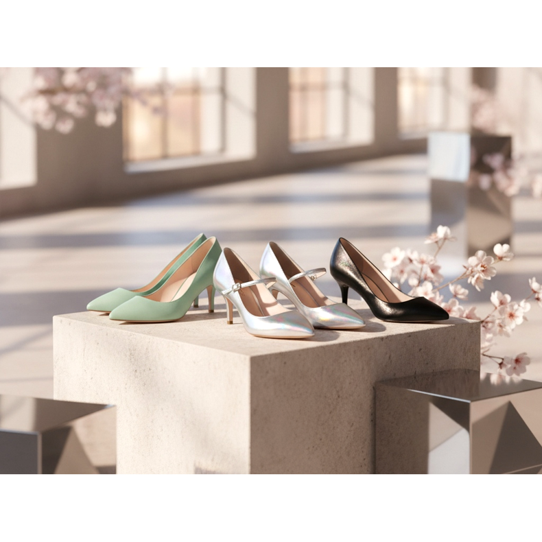 Uma das novidades mais famosas da temporada é a volta dos saltos gatinho. Estes saltos baixos e finos, de 3 a 5 cm de altura, conseguem o equilíbrio perfeito entre elegância e conforto. As passarelas foram dominadas por modelos com bico pontudo, em tons pastéis e variantes metálicas.