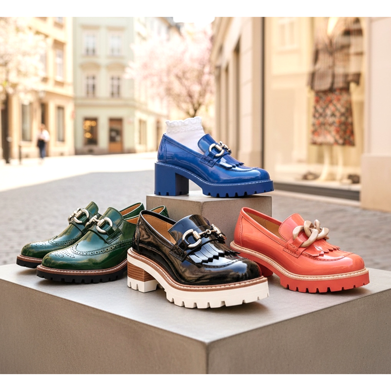 Os mocassins mantêm uma posição forte nas tendências de calçado de 2026. Nesta temporada dominam os modelos com um carácter um pouco mais vanguardista - mocassins com sola grossa e contrastante, modelos com punhos e decorações na biqueira, bem como variantes patenteadas em cores fortes, como o azul centáurea, o verde garrafa ou o coral.