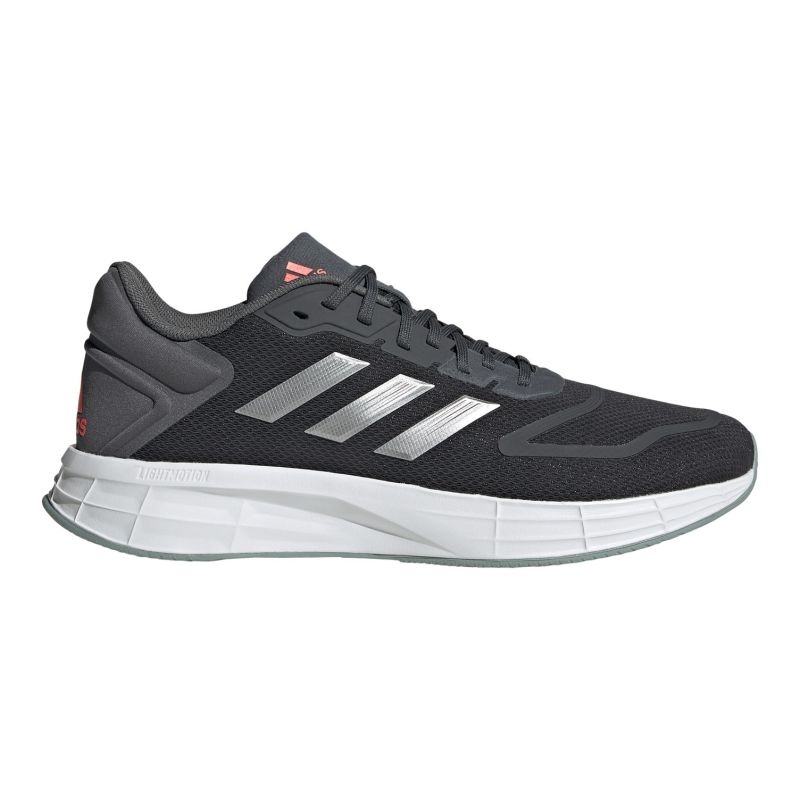 Os calçados Adidas Duramo 10 M estão disponíveis na cor cinza universal, o que os torna fáceis de combinar com diversos trajes de treino.