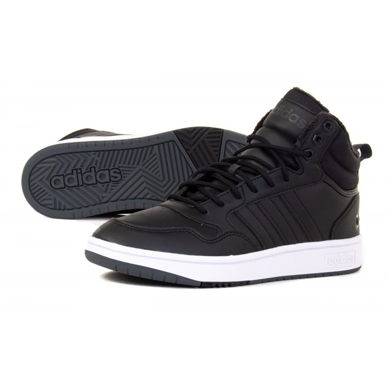 Uma característica dos sapatos Hoops 3.0 Mid Wtr M GZ6679 é o seu esquema de cores único - a cor preta dominante torna o calçado extremamente universal e combina facilmente com vários estilos.
