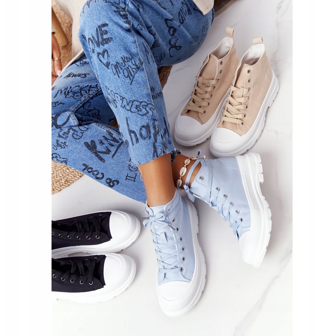 Durante anos, a moda urbana ficou incompleta sem um item icônico do guarda-roupa - os tênis de cano alto, que combinam conforto, estilo e universalidade. Expresse-se com o tênis feminino de cano alto FB2 com sola grande Blue Trissy - sapatos que darão personalidade a qualquer estilo.