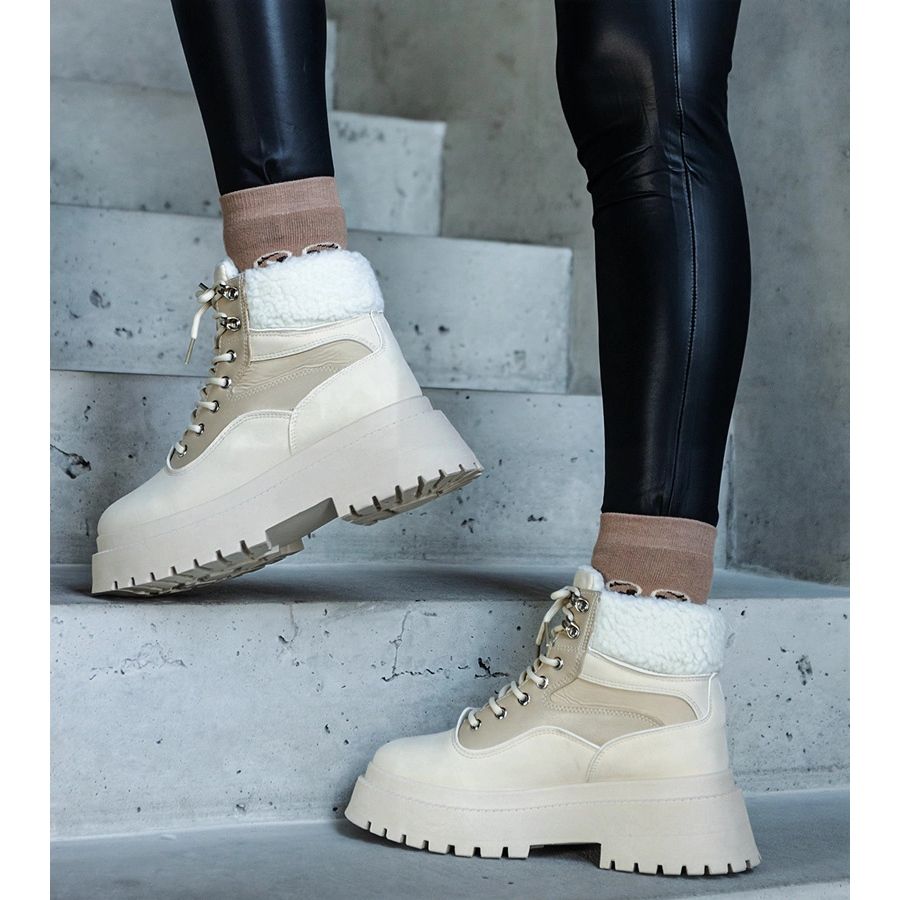Trappers bege em uma sola grossa com pêlo é um must-have no guarda-roupa de todas as mulheres para a próxima temporada! Esses sapatos elegantes combinam design elegante com funcionalidade, o que os torna a escolha perfeita para os dias de inverno. Graças ao aquecimento e alta no tornozelo, eles proporcionam conforto e calor, mesmo nos dias mais frios.