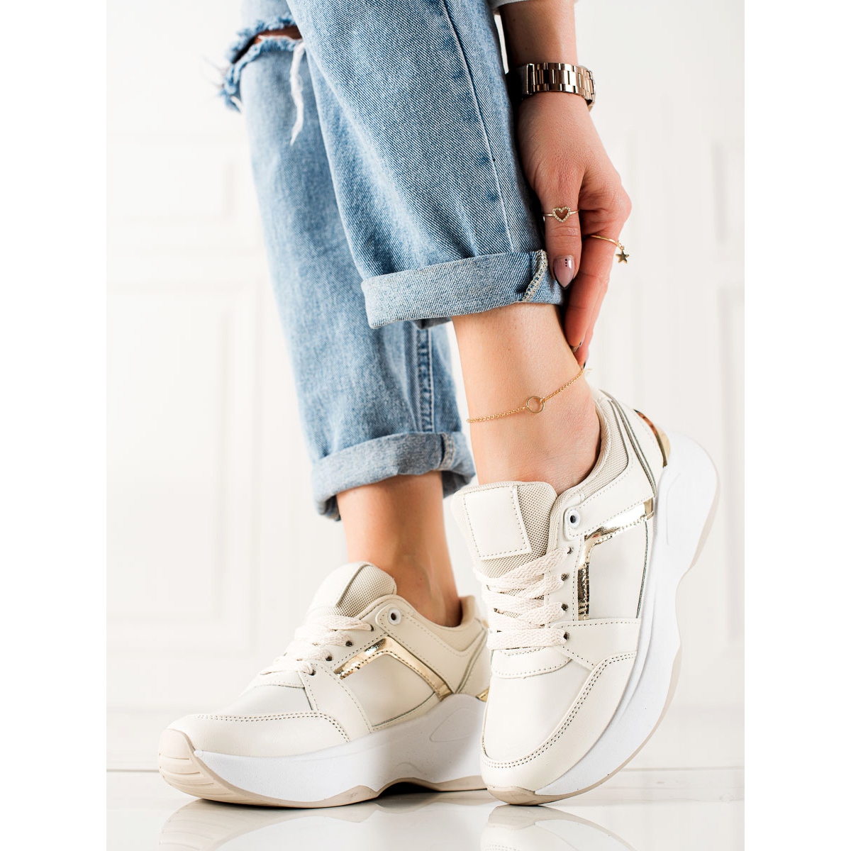 Estes ténis bege sem salto são a escolha perfeita para todas as mulheres elegantes. O seu design minimalista e sem padrões torna-os fáceis de combinar com vários estilos, e os materiais ecológicos são uma vantagem adicional que irá satisfazer os consumidores conscientes.