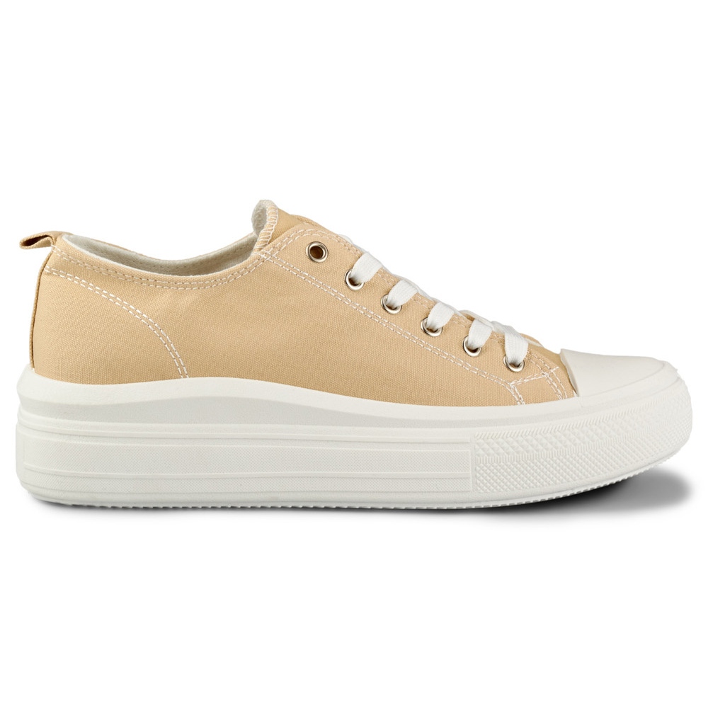 Aproveite a leveza de cada passo com tênis bege em plataforma baixa e adicione uma pitada de elegância despretensiosa aos seus looks.