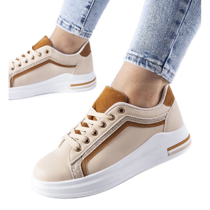 Os tênis bege na plataforma de Mayfield são uma ótima opção para mulheres ativas que desejam combinar estilo com conforto. Feito de couro ecológico de alta qualidade, eles não são apenas arejados, mas também ecológicos. Sua cor bege universal é ótima com estilizações de verão, e a sola branca dá frescor e caráter moderno.