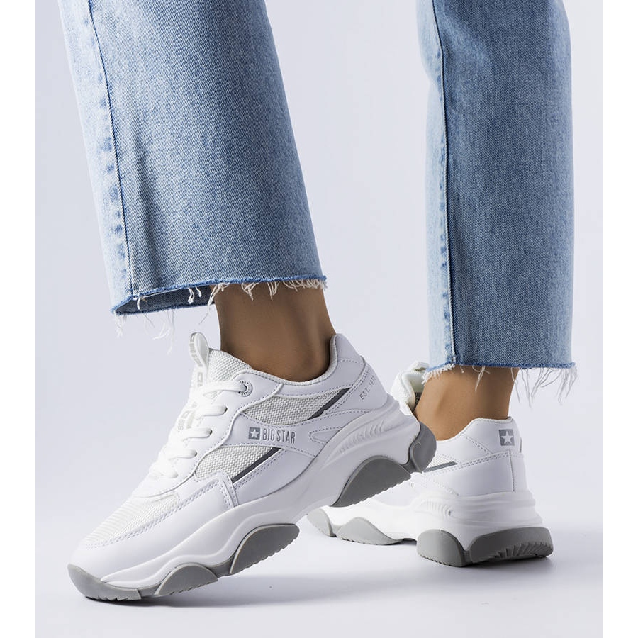 O estilo deste modelo é enfatizado pela combinação vanguardista de couro e tecido ecológico, bem como pelo contraste de cores da moda nesta temporada - branco misturado com cinza. Esses detalhes fazem com que os tênis Big Star JJ274579 sejam fáceis de combinar com vários estilos, desde jeans e camisetas casuais até looks urbanos mais elegantes.