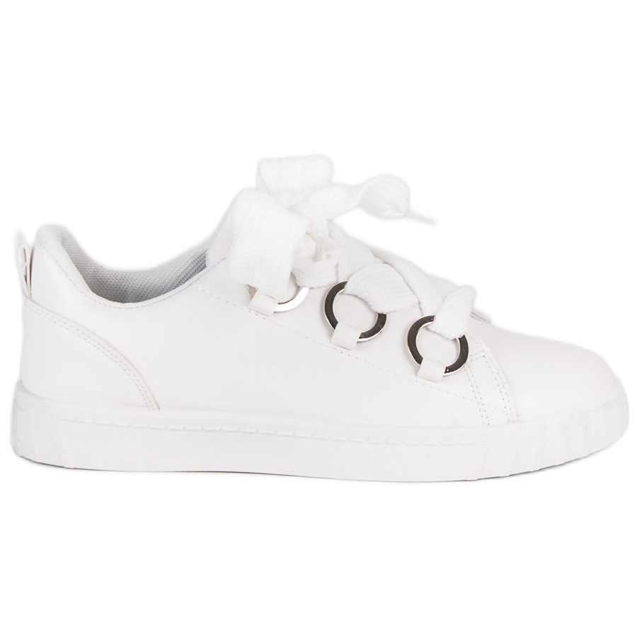 Descubra um estilo único com os tênis Super Me brancos com atacadores, que combinam a casualidade esportiva com uma expressão elegante. Estes sapatos femininos da moda distinguem-se pelos atacadores largos e incomuns montados em atraentes anéis de metal prateado, o que lhes confere um caráter único.