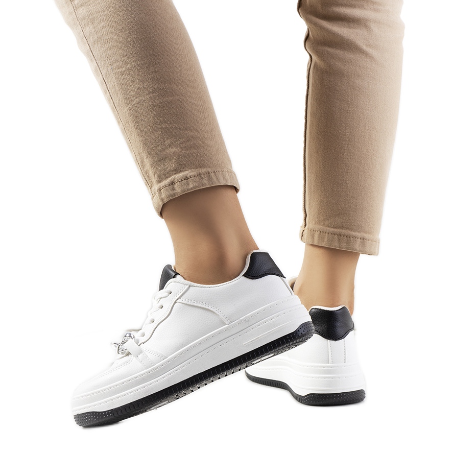 Tênis elegantes e brancos Mary é uma proposta ideal para o verão - eles combinam uma sola elegante e elevada com um corte baixo clássico. Feito de couro ecológico de alta qualidade, com uma corrente decorativa que lhes dá caráter e os torna um sotaque distinto de cada estilização.