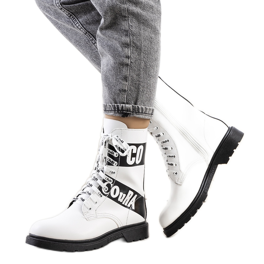 Ótimo para aparência casual - jeans, carga, blusas de grandes dimensões, bem como para vestidos de meninas com meias grossas. Trappers brancos com inscrições adicionarão o caráter de cada estilização e atrairão looks.