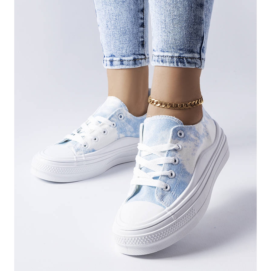 Os tênis clássicos de Blais em tons de branco e azul são a escolha perfeita para os dias de verão. Uma sola clara e elevada (aprox. 5 cm) adiciona um personagem elegante e o figura opticamente flag, e o tecido leve garante o conforto. O modelo amarrado em atacadores, com nariz redondo - universal e fácil de combinar com muitos estilos.