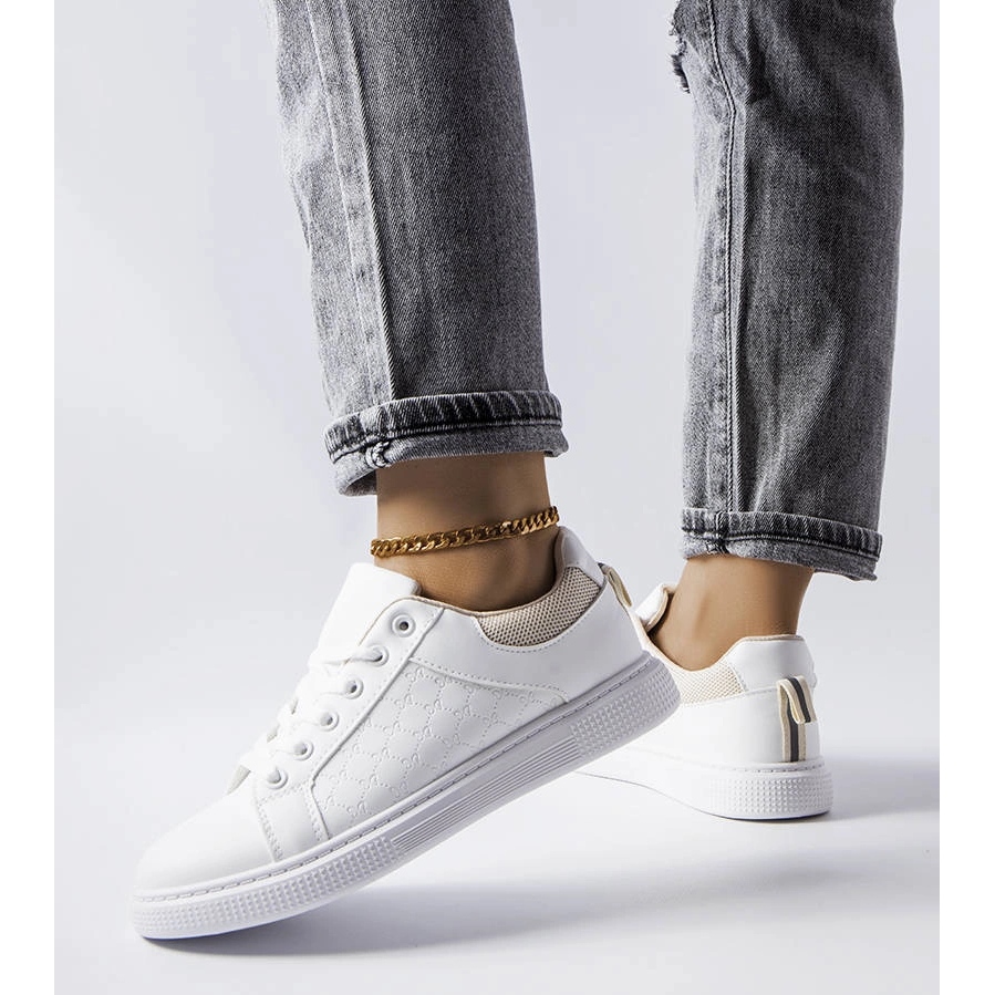 Os tênis clássicos de mulheres brancas, que se encaixam facilmente a cada estilização de verão. A parte superior ecológica de couro foi decorada com gravação e uma sutil fixação bege, o que adiciona caráter aos sapatos, sem perturbar sua simplicidade. Eles se misturam bem com jeans, um vestido leve ou saia maxi - no verão, enfatizam o bronzeado e complementam o visual casual.