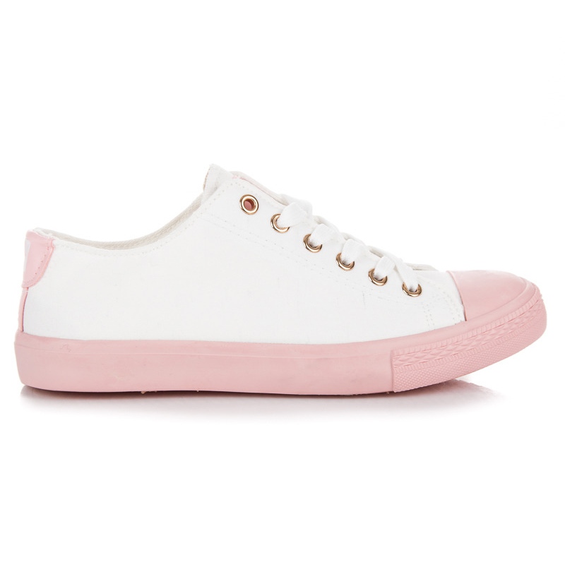 Esses tênis são caracterizados por uma biqueira redonda, o que lhes confere charme e elegância. As cores em tons de branco e rosa fazem com que eles se encaixem perfeitamente em vários estilos – tanto casuais quanto mais esportivos. A altura da plataforma de 3 cm permite um pouco de altura e ainda é confortável de usar.