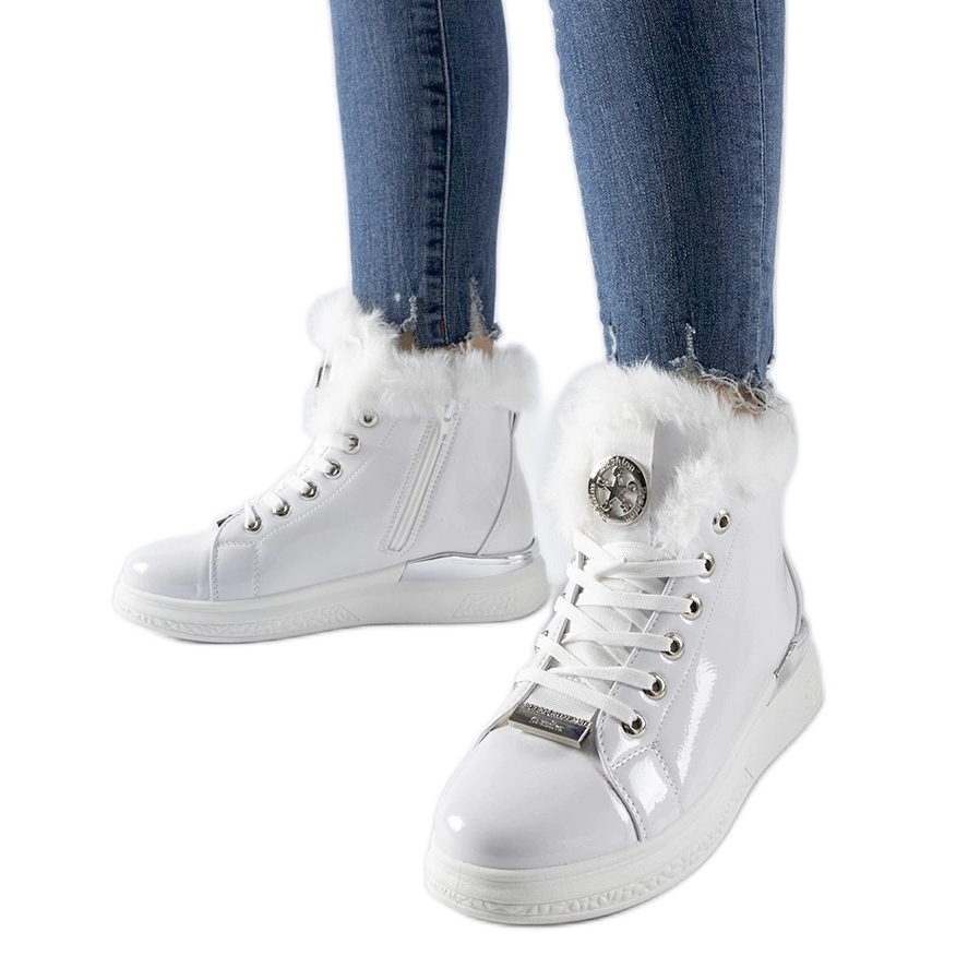 O acabamento envernizado dá a esses tênis um caráter elegante que combina bem com várias estilizações. Graças ao zíper, vestir e remover calçados se torna rápido e com problemas. Os tênis envernizados brancos com pêlo não estão apenas na moda, mas também calçados funcionais que certamente atrairão a atenção.