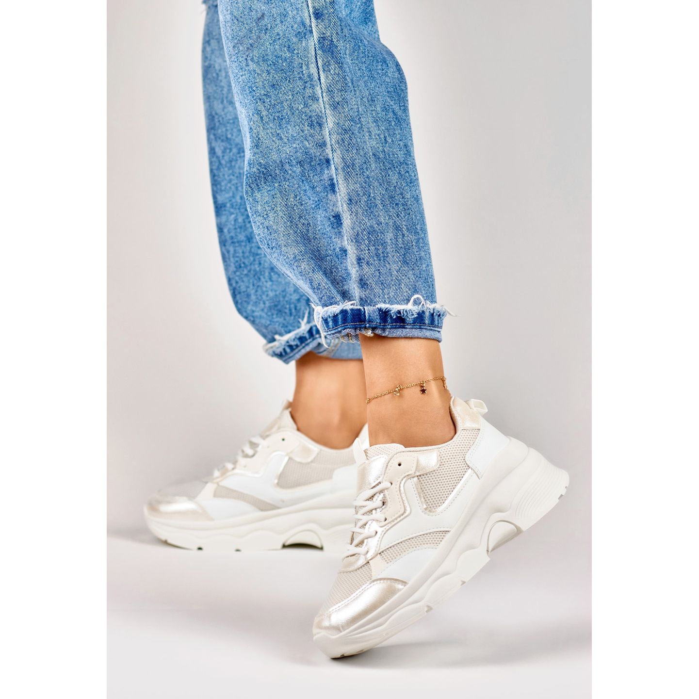 Os tênis clássicos e universais de Geori em White são uma proposta para mulheres que valorizam a aparência da moda e o conforto de uso. Graças à combinação de couro ecológico e materiais têxteis arejados, os sapatos são leves, respiráveis e fáceis de limpar. A plataforma de 6 centímetro aumenta opticamente as pernas, fornecendo suporte estável.
