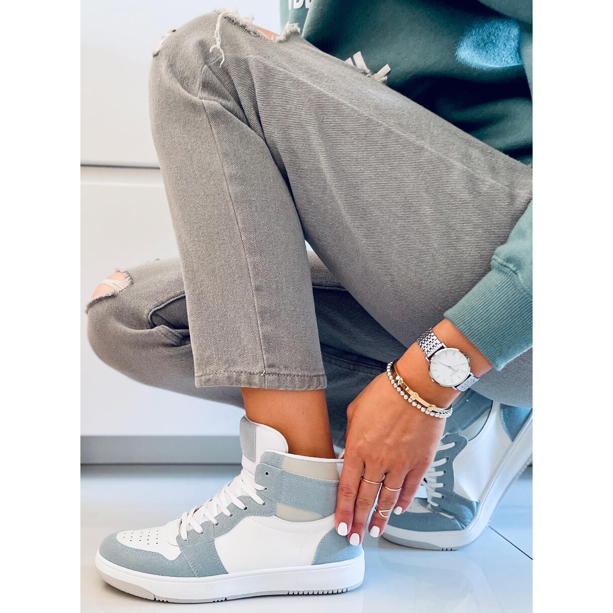 Apresentamos ténis de cano alto Dorcas Green exclusivos em branco e azul do fabricante PA1, que se adaptam perfeitamente às tendências desta primavera e verão! Estes sapatos com cordões não são apenas uma adição atraente ao estilo do dia a dia, mas também um calçado confortável projetado para mulheres ativas.