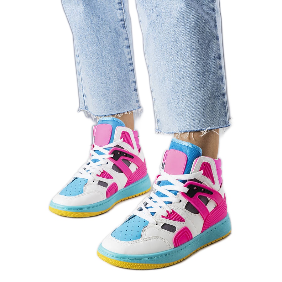 - cor: branco com fúcsia e detalhes em azul (branco/azul/rosa), sola amarela