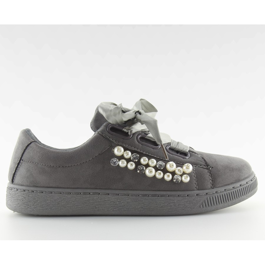 Os tênis cinza H99-11 cinza com pérolas são calçados femininos exclusivos que combinam perfeitamente design moderno com conforto de uso. Distinguem-se por uma decoração delicada que lhes confere um carácter romântico - em vez das tradicionais rendas, utiliza-se uma elegante fita de cetim, que vai ao encontro das últimas tendências da estação.