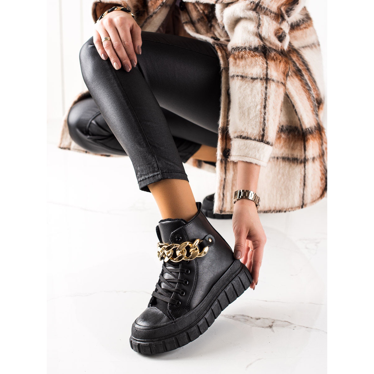 Descubra elegância e conforto únicos com os tênis TRENDI na cor preta. Estes sapatos femininos da moda combinam o estilo casual com as últimas tendências, perfeitos para o outono/inverno. Confeccionados em couro ecológico de alta qualidade, oferecem não só um aspecto estético, mas também conforto de uso.