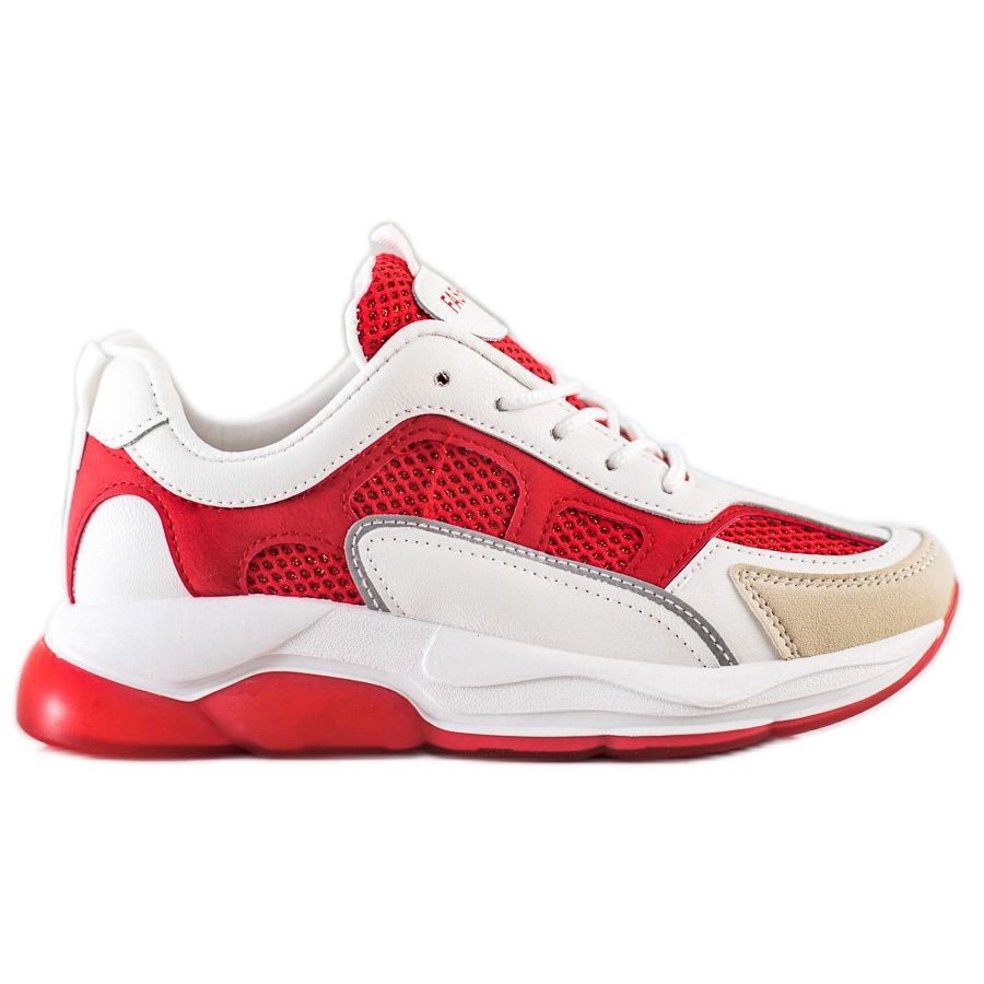 A parte superior do calçado distingue-se por cores interessantes - elementos lisos brancos, elementos de malha vermelha e reforço bege nos dedos. A parte vermelha, coberta com glitter brilhante, confere ao conjunto um visual fashion e impressionante, perfeito para os amantes da moda.