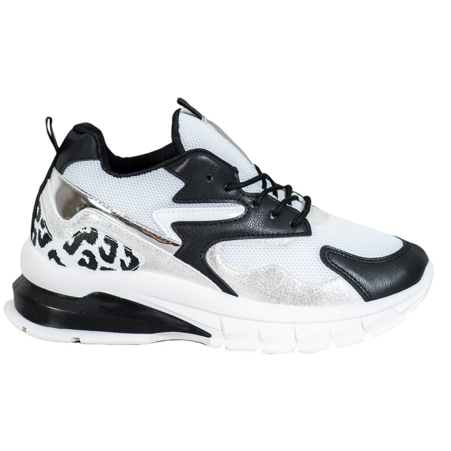 Confeccionado em material de alta qualidade, a parte externa do calçado impressiona pelo cabedal branco decorado com detalhes pretos de diversos formatos e tamanhos. Além disso, há detalhes prateados na lateral e acima do salto, que conferem ao tênis um visual único e moderno. Um contraforte macio e fechado e uma decoração original com motivo manchado garantem conforto de uso e ao mesmo tempo chamam a atenção.