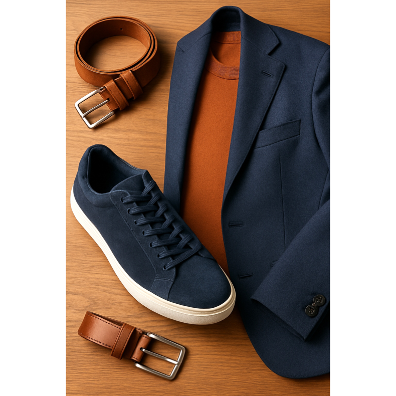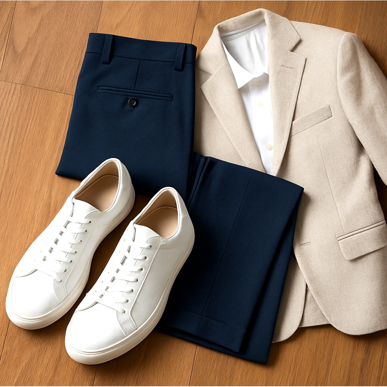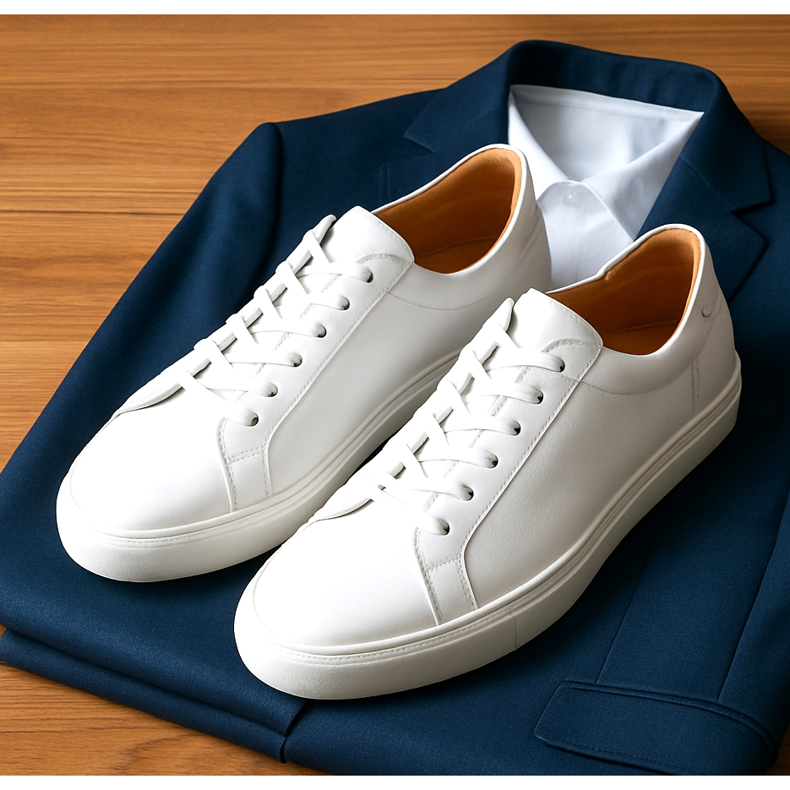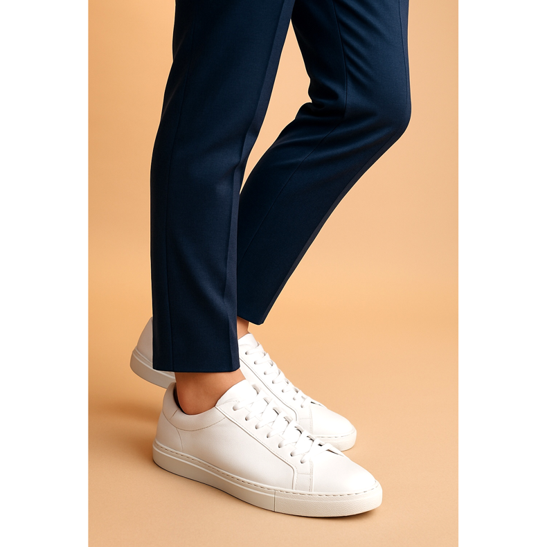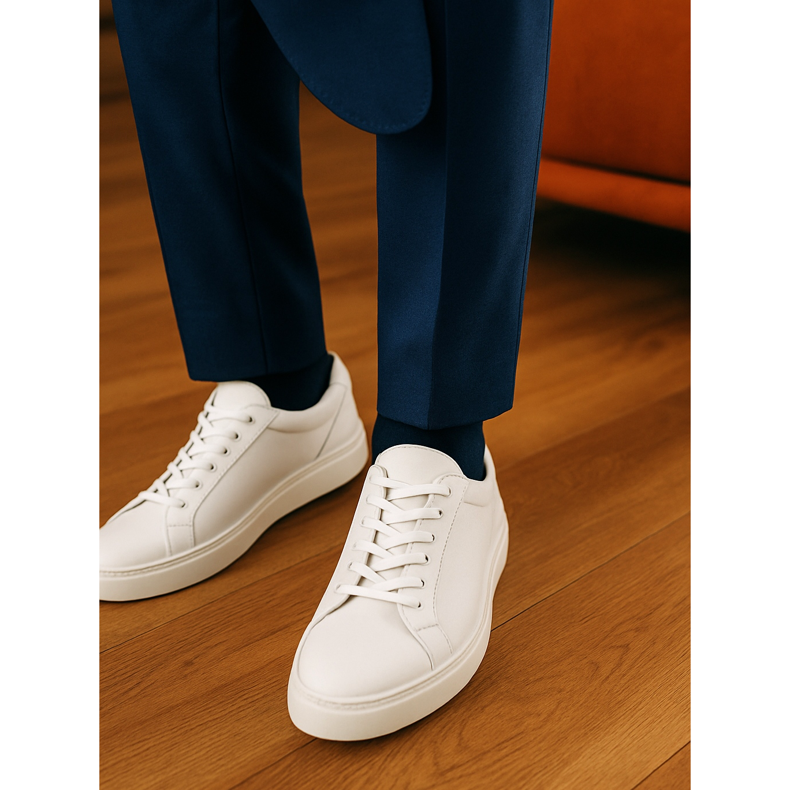 Nem todo tênis combina com terno. Esqueça os tênis de corrida volumosos ou os tênis desgastados da academia. Para calças elegantes, opte por modelos minimalistas e de silhueta esbelta (os chamados low profile). A escolha mais segura são tênis de couro branco, sem logotipos desnecessários e inserções coloridas. O branco puro acrescenta frescor e combina perfeitamente com azul marinho, cinza e bege.