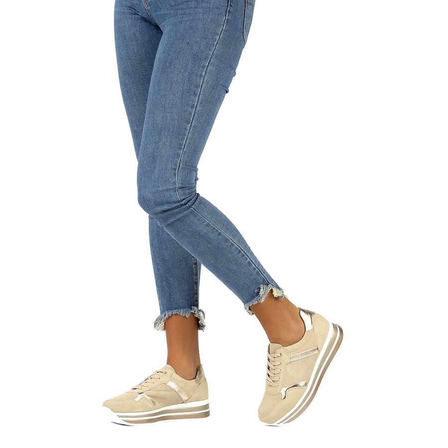 Detalhes: Tênis couro camurça Filippo DP2004 / 21 BE bege dourado